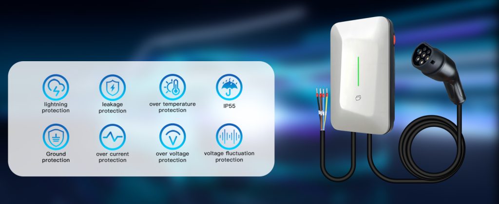 Multiple Protection: The ev charger providing lightning-proof, leakage, over temperature, IP55 rating waterproof, short circuit, over current, over voltage and voltage fluctuation protection for your safety. Also it has Emergency stop button to deal with emergencies.